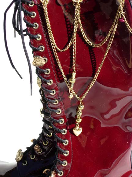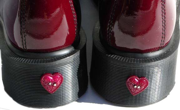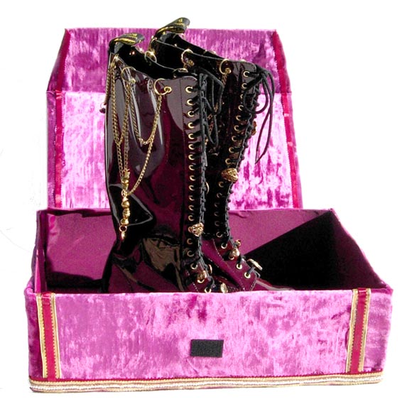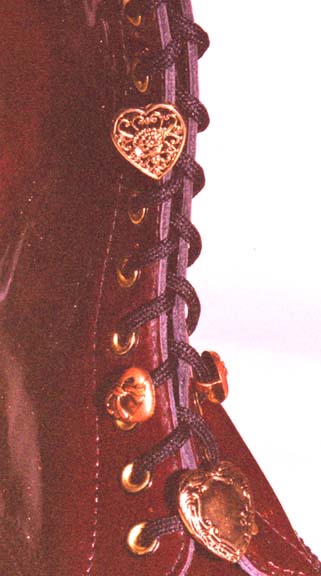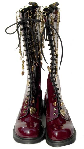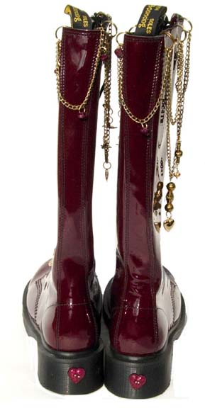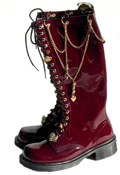 | These are the Desire Docs. They are a size UK 8 (equal to a US ladies 10, or US mens size 9), 20 eyelet, deep burgundy patent leather. They were auctioned at the Fiddler's Green Auction in Minneapolis, Minnesota, November 2004, to raise funds for the Comic Book Legal Defense Fund (CBLDF) Desire loves attention, and will surely find it as these have gone home with The Fabulous Lorraine and they will have frequent opportunities to be strutted on stage during performance of Folk UnderGround. |