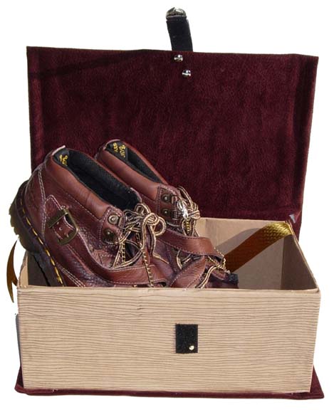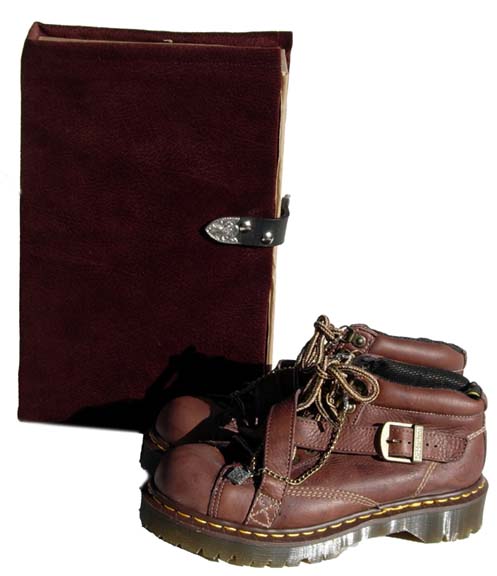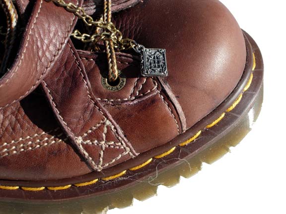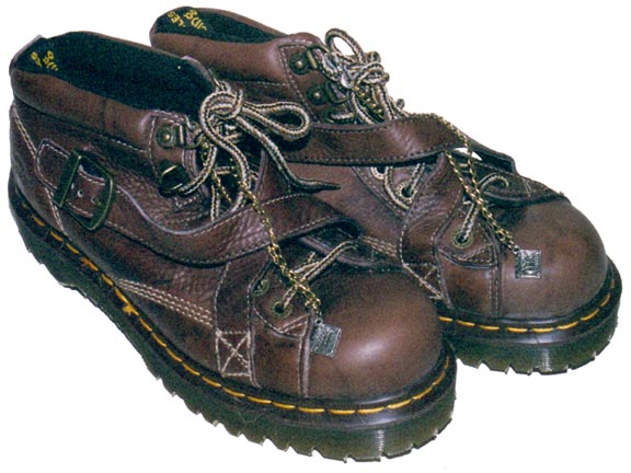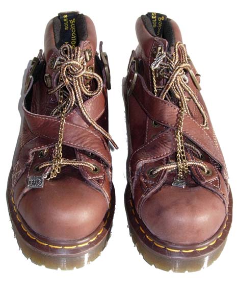 | These are the Destiny Docs. They are a size UK 8 (equal to a US ladies 10, or US mens size 9), soft brown leather with lace-up tie closure and buckle straps. They were auctioned at the Fiddler's Green Auction in Minneapolis, Minnesota, November 2004, to benefit the Comic Book Legal Defense Fund (CBLDF). They were promptly put to good use by Ray after the auction as part of his Destiny costume for the Masquerade Ball. |