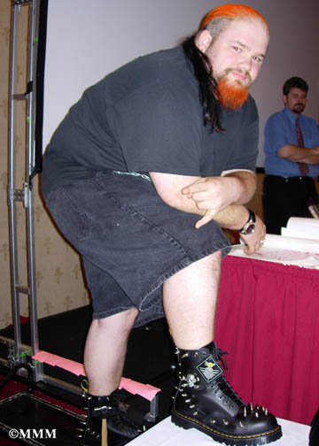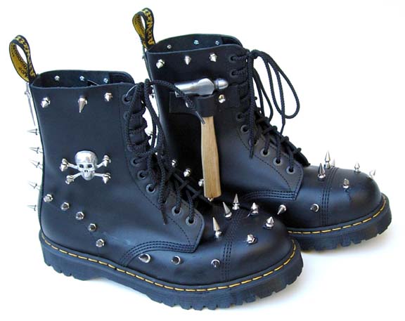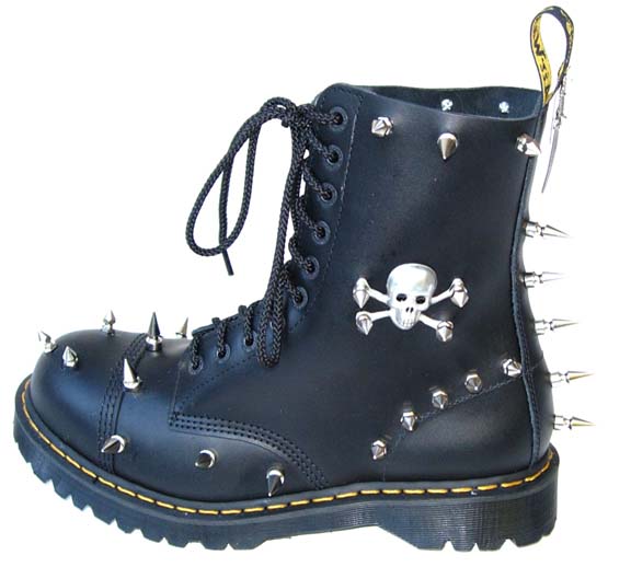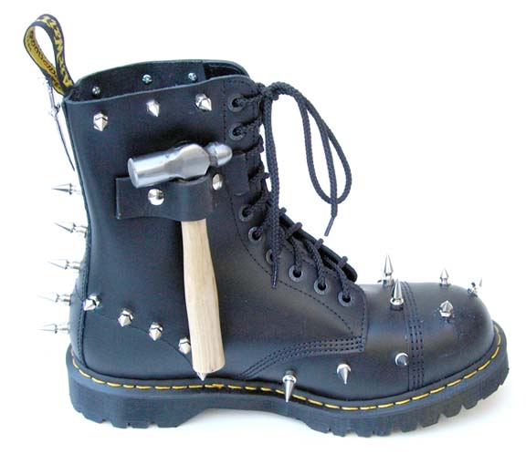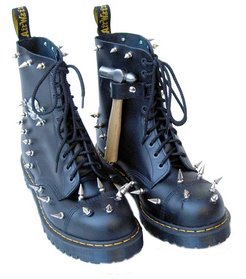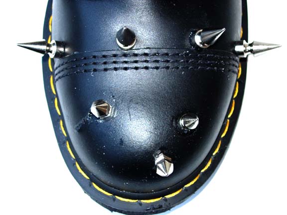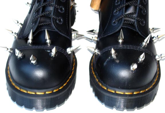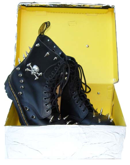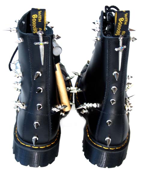 | These are the Desruction Docs. They are a size UK 12 (equal to a US ladies 14, or US mens size 13), cap steel toe, 10 eyelet lace-up. All spikes were screwed on with the exception of those on the steel toes, which were glued. I think they've found the right home though, as Walker has a drill press which should conquer the steel toes. They were auctioned in Minneapolis, Minnesota, November 2004, at the Fiddler's Green Auction to benefit the Comic Book Legal Defense Fund (CBLDF) |
